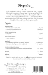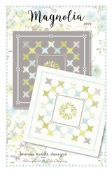 A magnolia wreath is a symbol of hospitality and is easy to recognise because of its large substantial leaves. Also, the magnolia flower represents endurance, eternity, and long life. Such a sweet reminder is the inspiration for this quilt design, from the appliqué wreath to the ‘petal’ blocks.